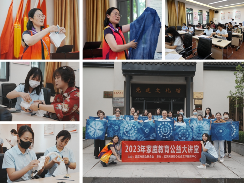 本次活動(dòng)邀請(qǐng)武漢光谷啟心社會(huì)工作服務(wù)中心老師進(jìn)行指導(dǎo)。活動(dòng)開始,老師向大家介紹了扎染的歷史與傳承,隨后老師現(xiàn)場(chǎng)演示幾種扎染花紋的扎節(jié)方式以及操作技巧,扎節(jié)時(shí)松、緊、疏、密的不同,使得扎染成品花色圖案千差萬(wàn)別,絢麗多姿。隨后,參會(huì)人員紛紛發(fā)揮著自己的想象力創(chuàng)造力,扎染出屬于自己獨(dú)一無(wú)二的花紋。